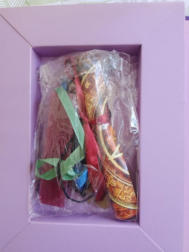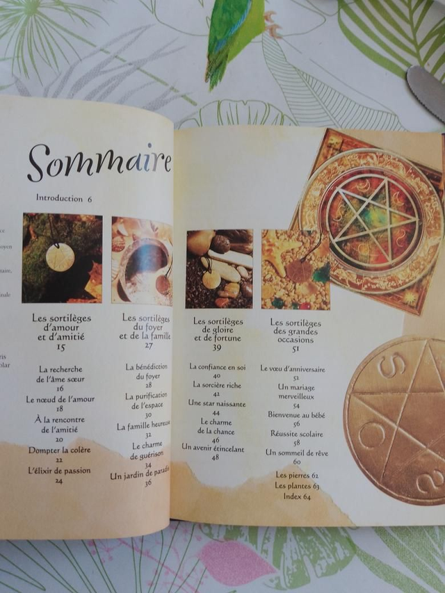 Un livret, une bougie, des rubans, un rouleau de parchemin, des bâtons d'encens, un médaillon magique