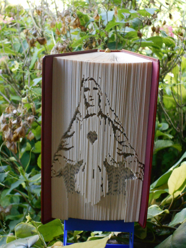 Vierge Marie, sculpture sur livre (livre d'occasion), sculpté page par page, à la main, environ 20 h de travail