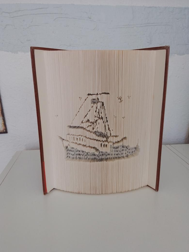 Bateau de pêche, sculpture sur livre (livre d'occasion), travail page par page, environ 25 h de travail